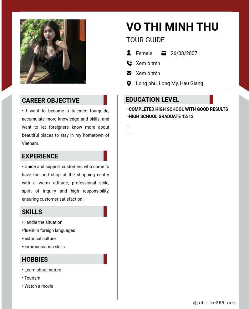 Xem hồ sơ ứng viên Vo Thi Minh Thu cần 2 điểm. Hồ sơ được cập nhật ngày: 22/12/2024