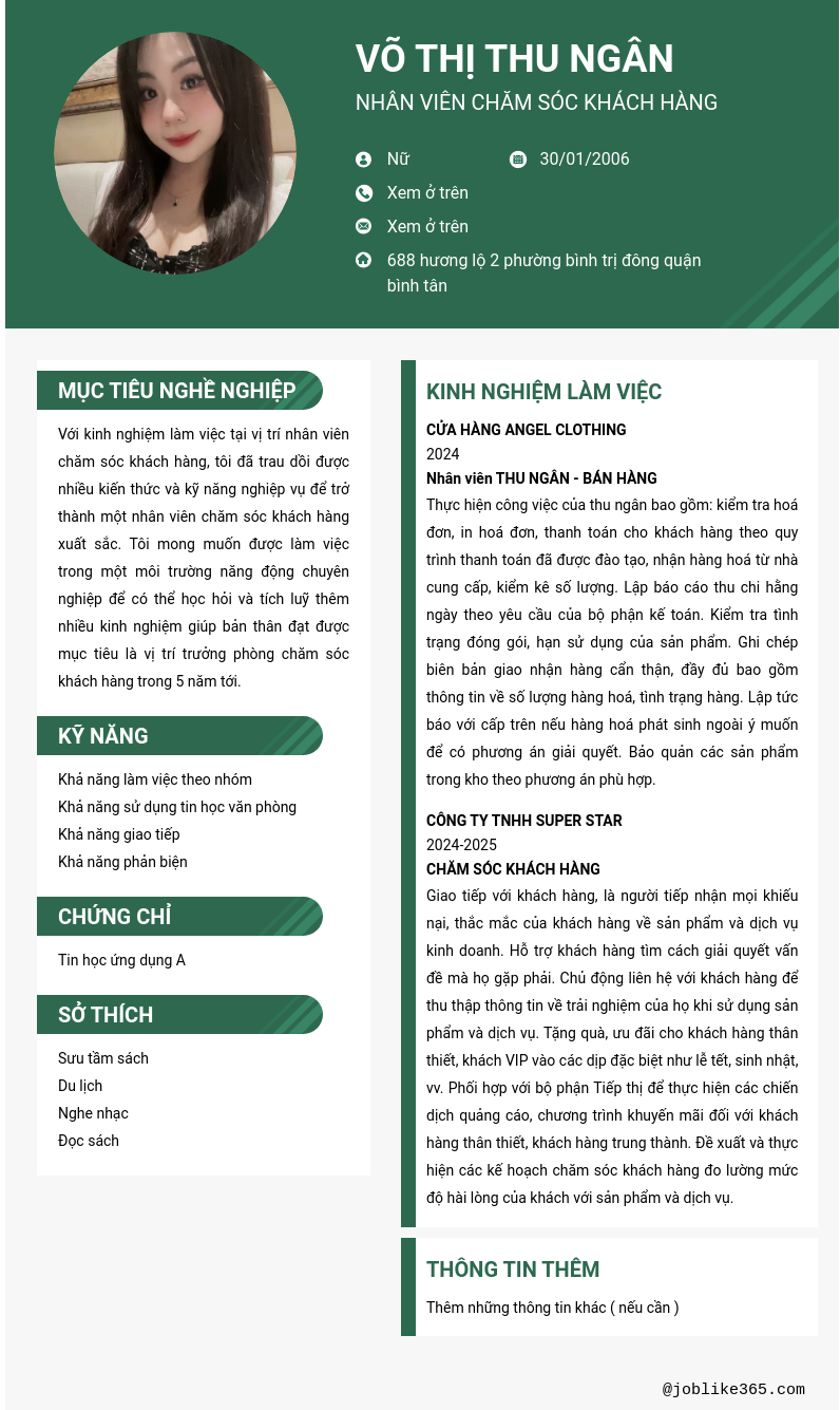 Xem hồ sơ ứng viên Võ Thị Thu Ngân cần 2 điểm. Hồ sơ được cập nhật ngày: 10/12/2025
