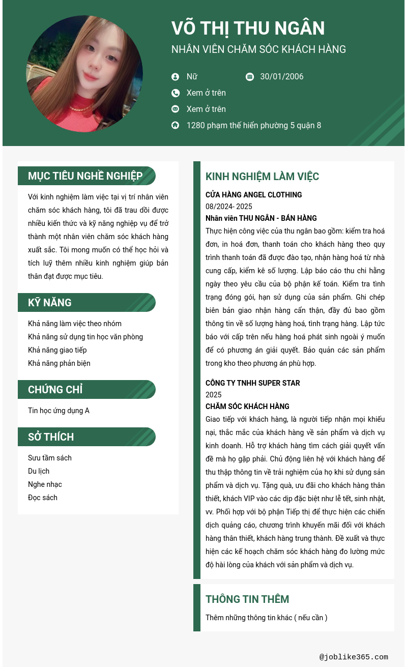 Xem hồ sơ ứng viên Võ Thị Thu Ngân cần 2 điểm. Hồ sơ được cập nhật ngày: 02/02/2026