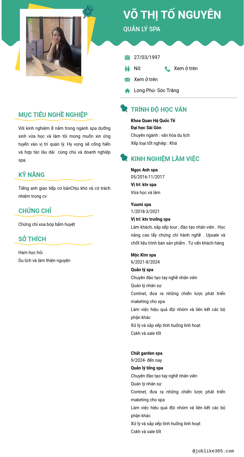 Xem hồ sơ ứng viên VÕ THỊ TỐ NGUYÊN cần 2 điểm. Hồ sơ được cập nhật ngày: 28/07/2025