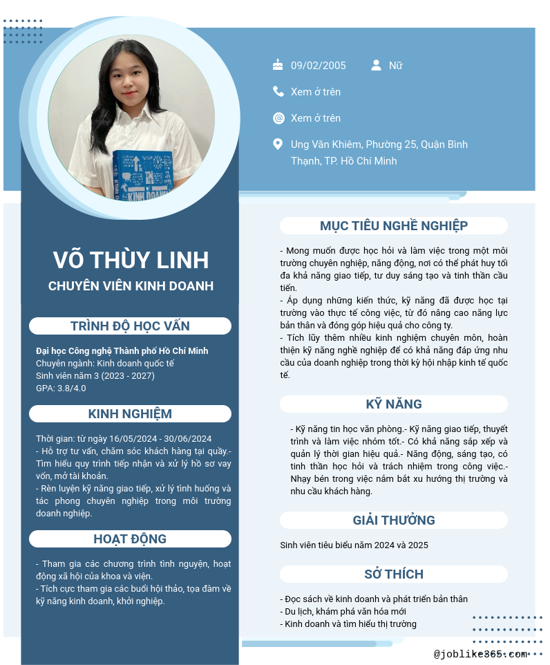 Xem hồ sơ ứng viên Võ Thùy Linh cần 2 điểm. Hồ sơ được cập nhật ngày: 14/10/2025