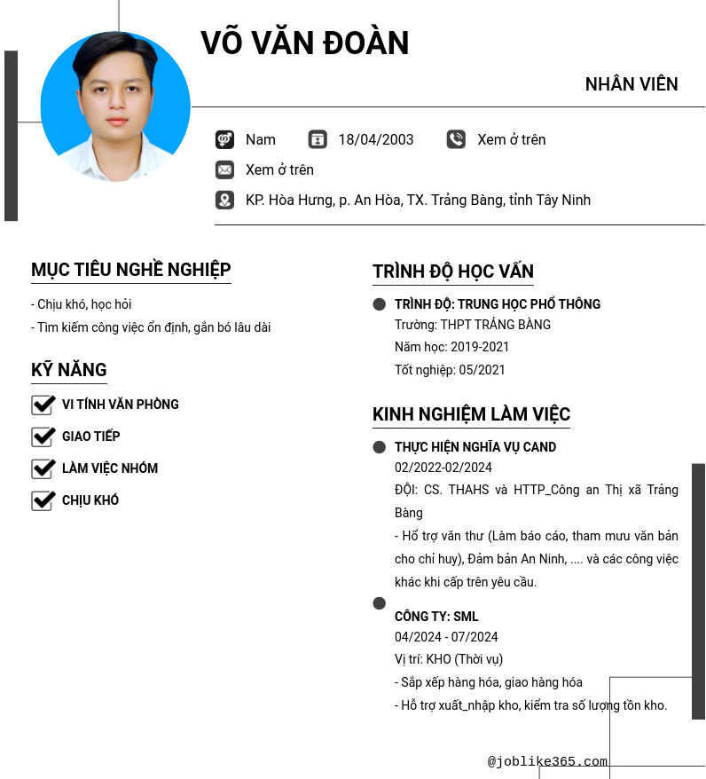 Xem hồ sơ ứng viên VÕ VĂN ĐOÀN cần 2 điểm. Hồ sơ được cập nhật ngày: 15/09/2024