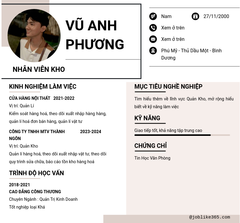 Xem hồ sơ ứng viên VŨ ANH PHƯƠNG cần 2 điểm. Hồ sơ được cập nhật ngày: 13/03/2025