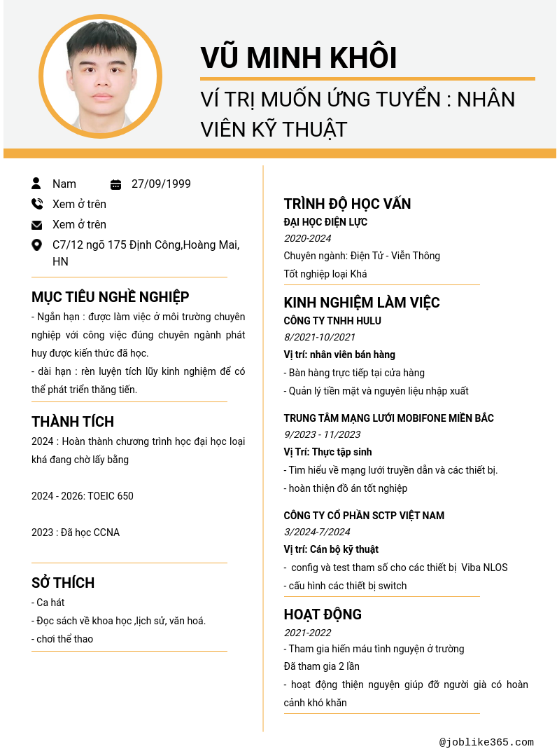 Xem hồ sơ ứng viên VŨ MINH KHÔI cần 2 điểm. Hồ sơ được cập nhật ngày: 31/10/2024