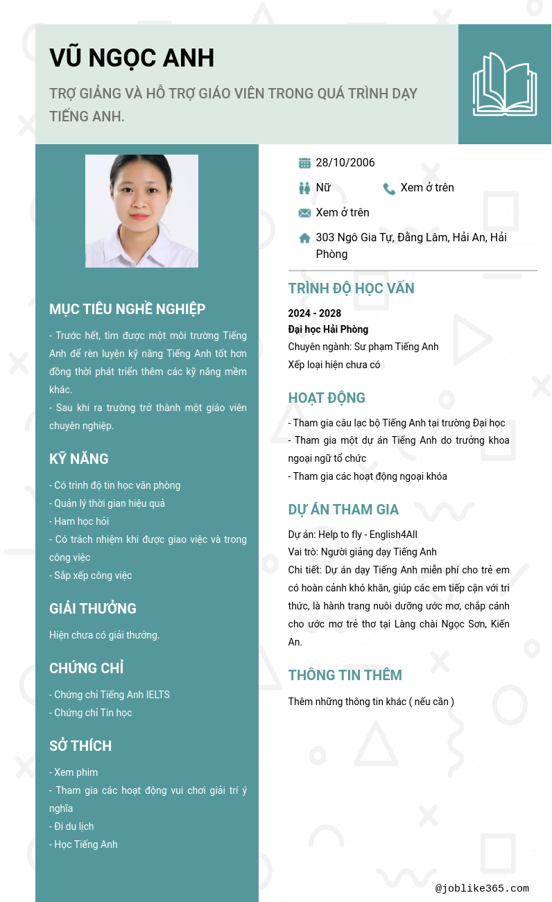 Xem hồ sơ ứng viên Vũ Ngọc Anh cần 2 điểm. Hồ sơ được cập nhật ngày: 19/10/2024