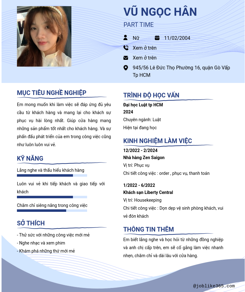 Xem hồ sơ ứng viên Vũ Ngọc Hân cần 2 điểm. Hồ sơ được cập nhật ngày: 25/07/2024