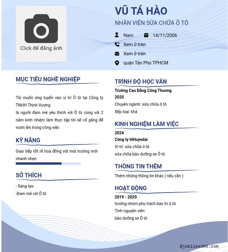 Xem hồ sơ ứng viên vũ Tá Hào cần 2 điểm. Hồ sơ được cập nhật ngày: 06/12/2024