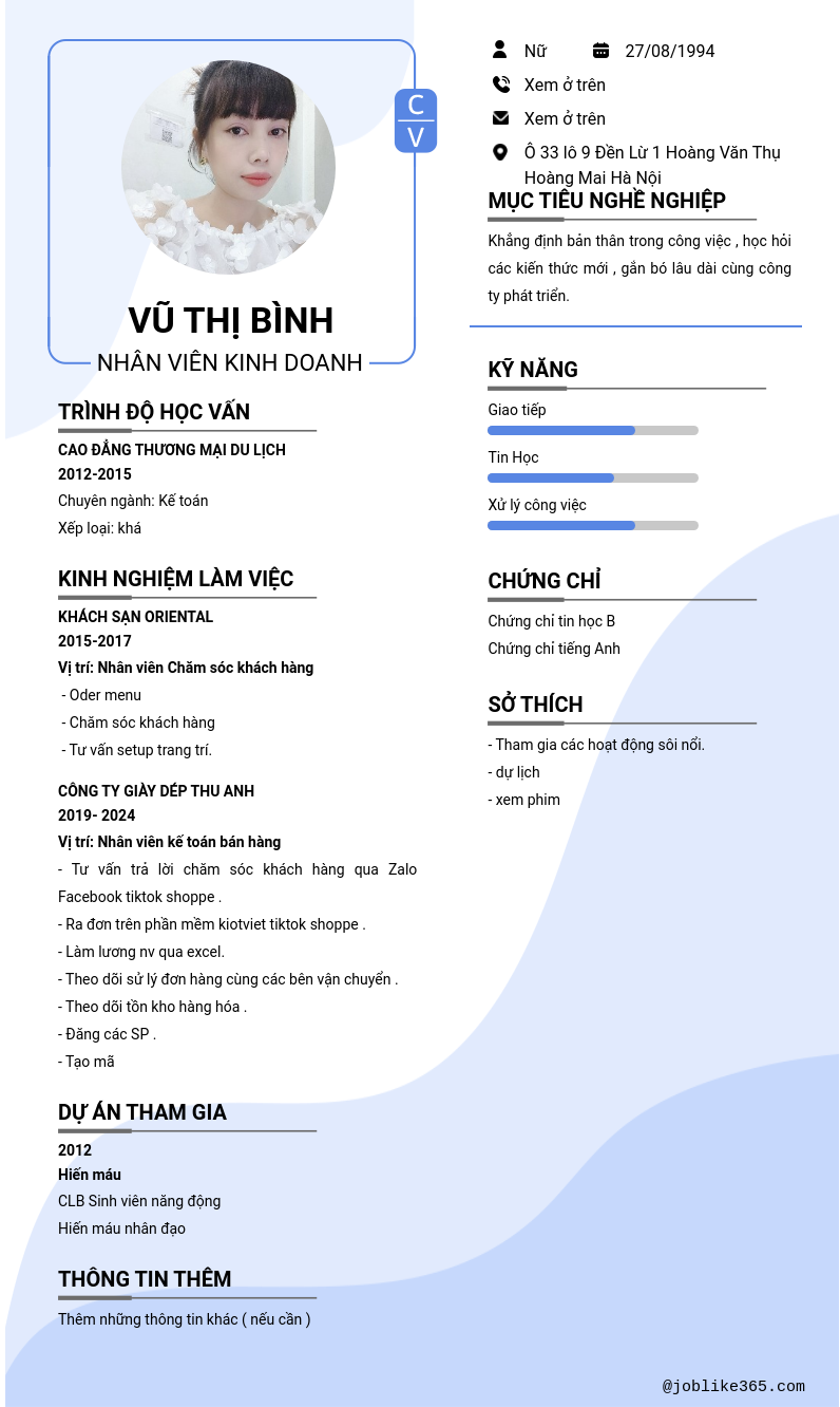 Xem hồ sơ ứng viên VŨ THỊ BÌNH cần 2 điểm. Hồ sơ được cập nhật ngày: 21/08/2024