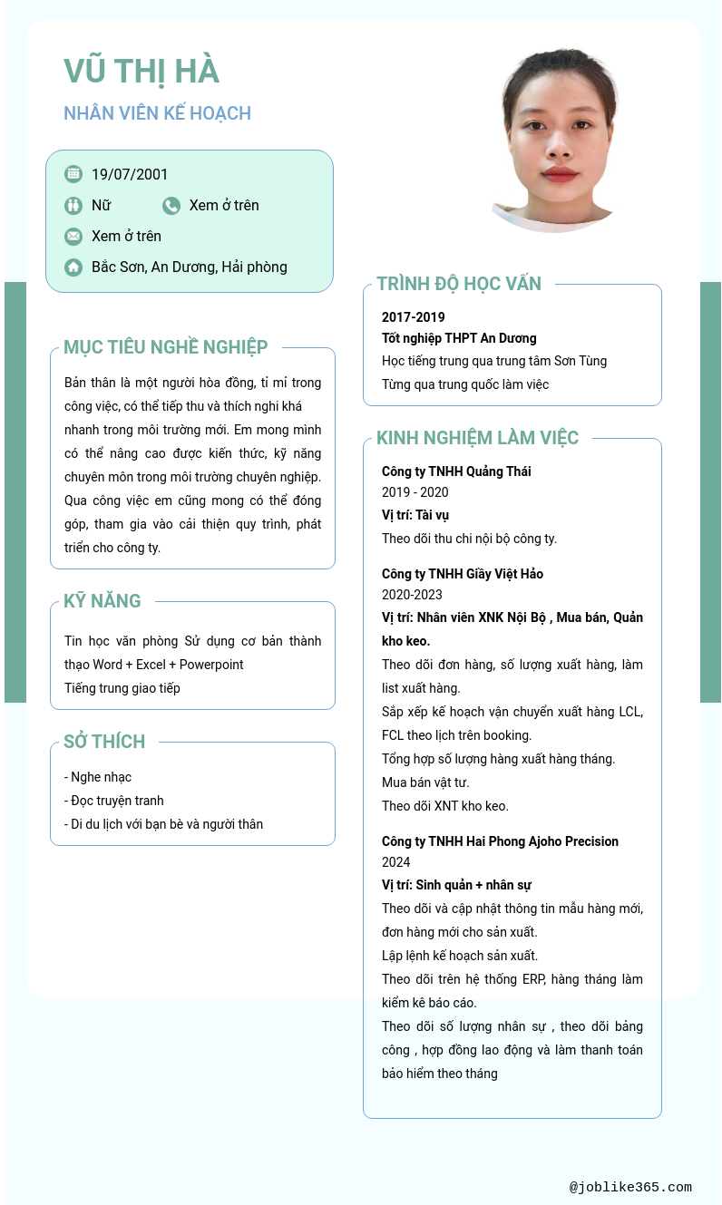 Xem hồ sơ ứng viên vũ thị hà cần 2 điểm. Hồ sơ được cập nhật ngày: 03/04/2025