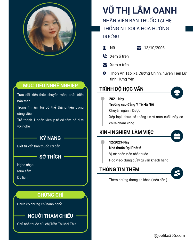 Xem hồ sơ ứng viên VŨ THỊ LÂM OANH cần 2 điểm. Hồ sơ được cập nhật ngày: 08/06/2024