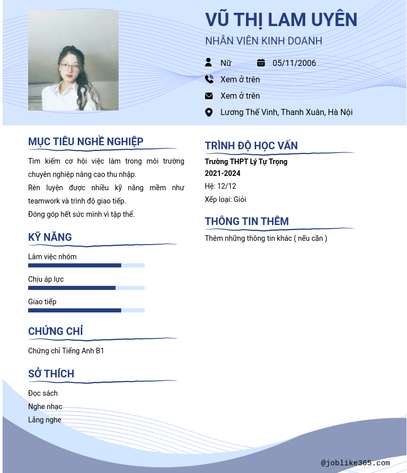 Xem hồ sơ ứng viên Vũ Thị Lam Uyên cần 2 điểm. Hồ sơ được cập nhật ngày: 28/10/2024