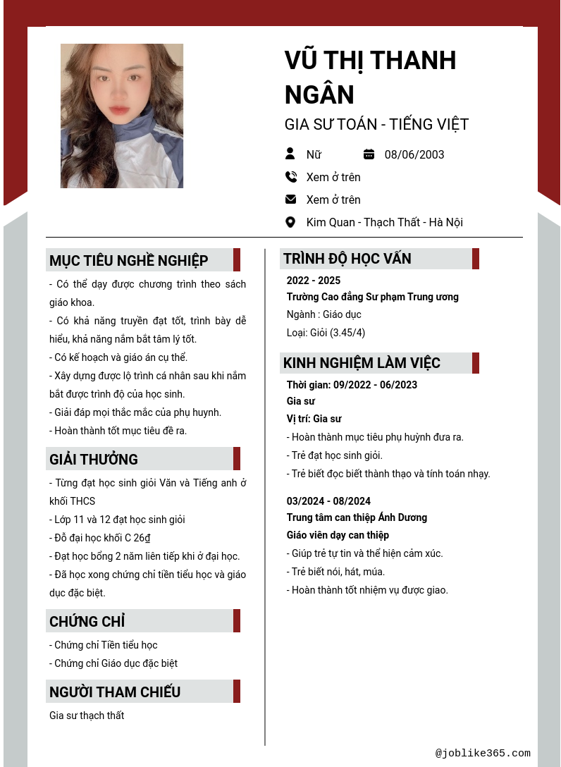 Xem hồ sơ ứng viên VŨ THỊ THANH NGÂN cần 2 điểm. Hồ sơ được cập nhật ngày: 23/08/2024