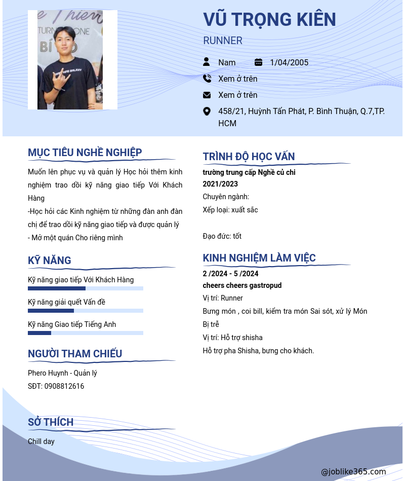 Xem hồ sơ ứng viên VŨ TRỌNG KIÊN cần 2 điểm. Hồ sơ được cập nhật ngày: 22/05/2024