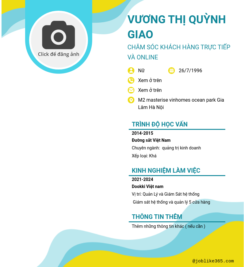 Xem hồ sơ ứng viên Vương Thị Quỳnh Giao cần 2 điểm. Hồ sơ được cập nhật ngày: 10/07/2024
