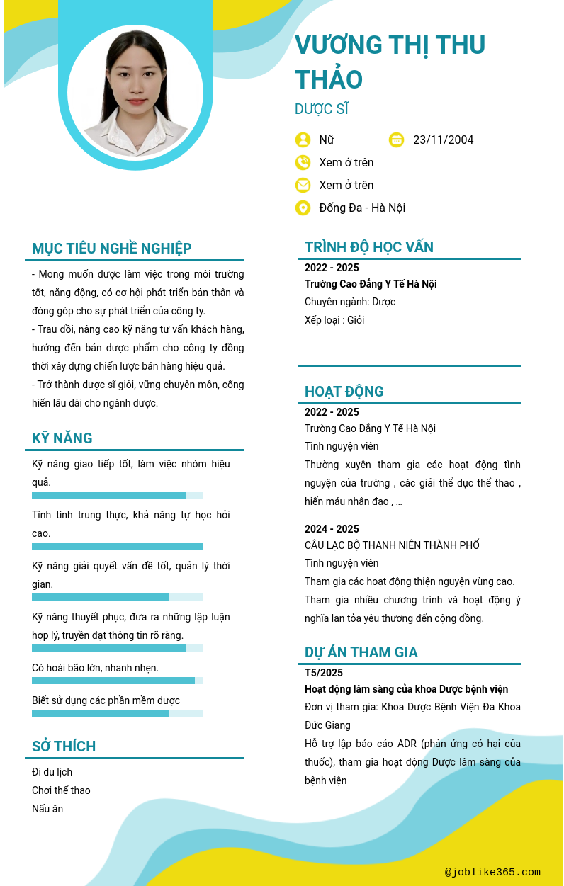 Xem hồ sơ ứng viên Vương Thị Thu Thảo cần 2 điểm. Hồ sơ được cập nhật ngày: 07/11/2025