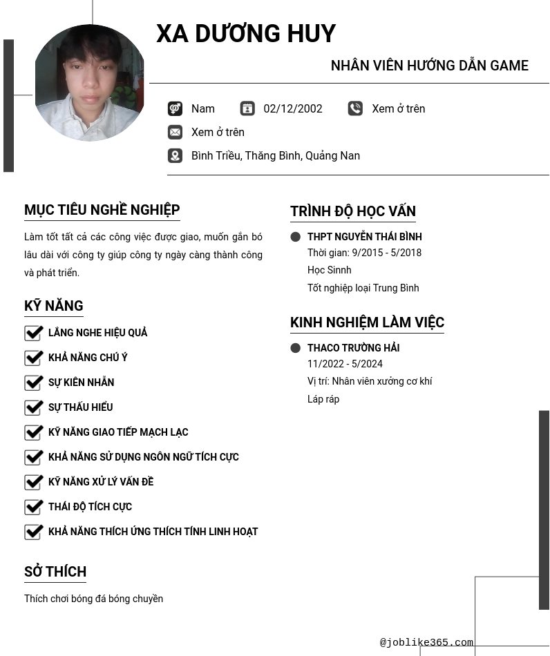 Xem hồ sơ ứng viên Xa Dương Huy cần 2 điểm. Hồ sơ được cập nhật ngày: 06/12/2024